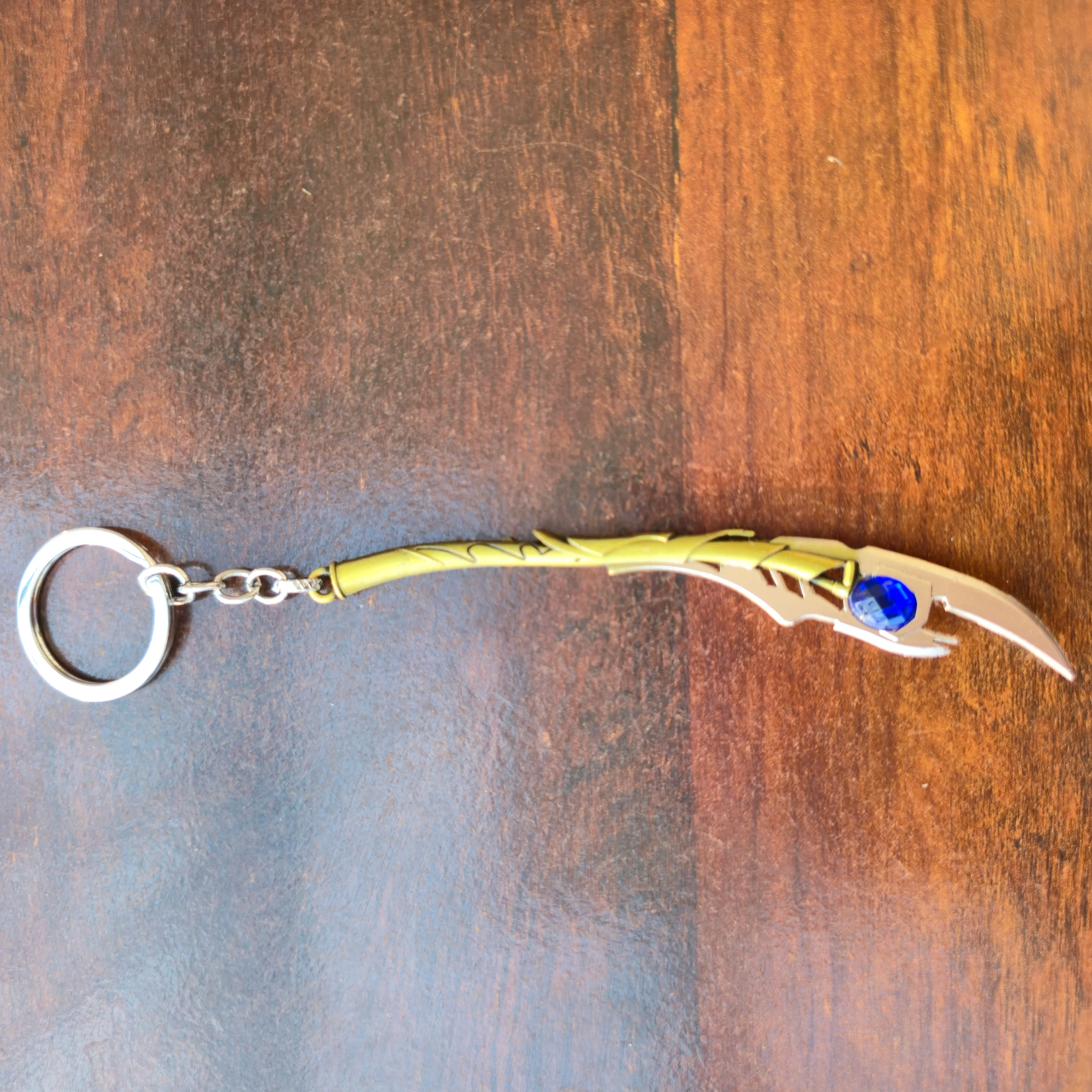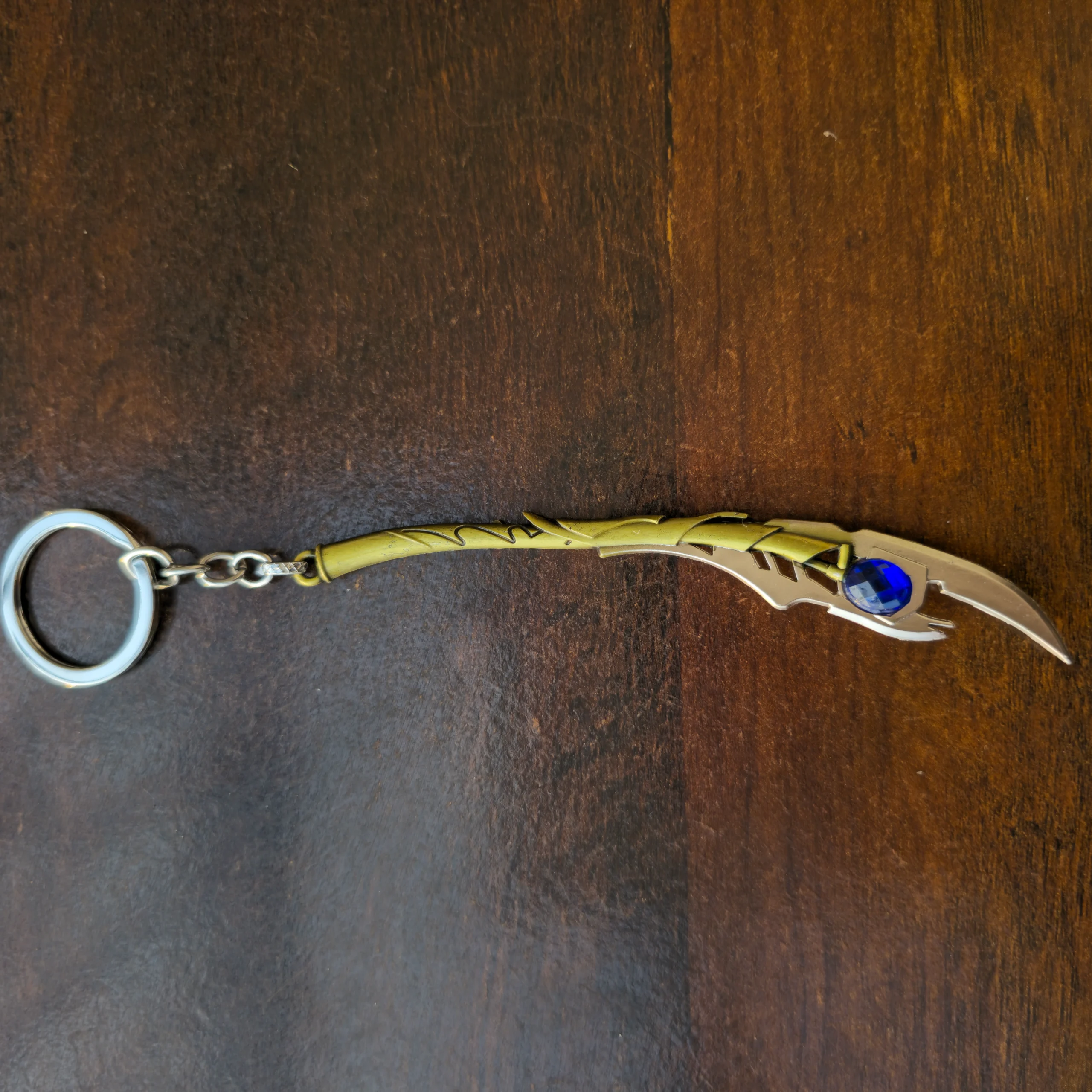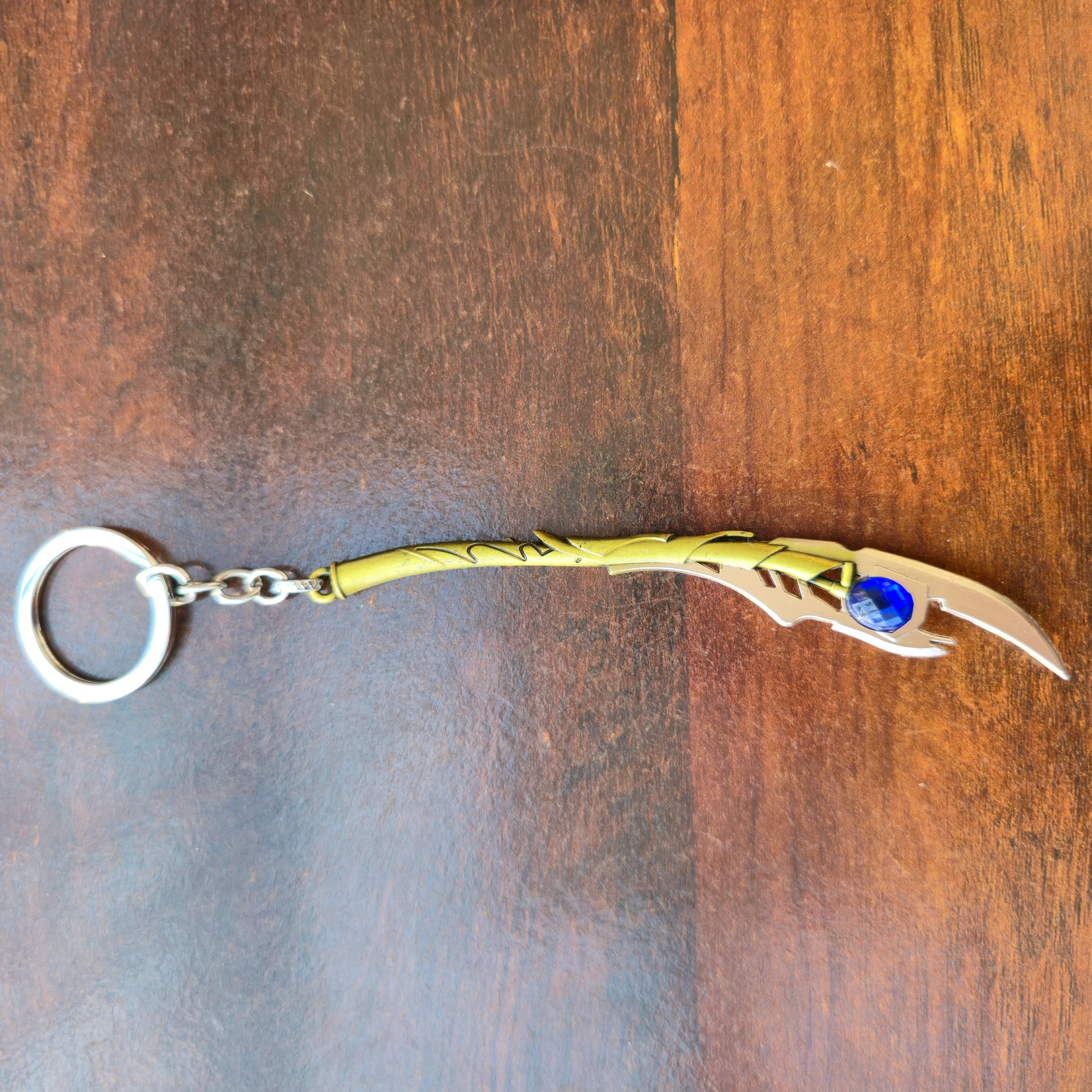 This detailed miniature features the elegant curved blade design, engraved textures, and a bright blue gem-like centerpiece, inspired by the legendary Mind Stone. The antique gold metallic finish gives it a premium, realistic, collectible look.