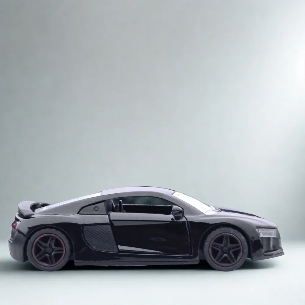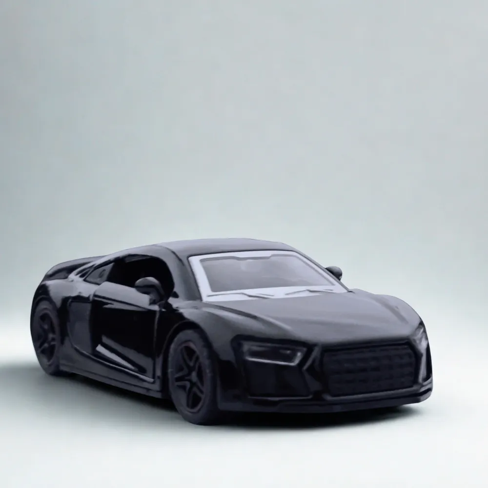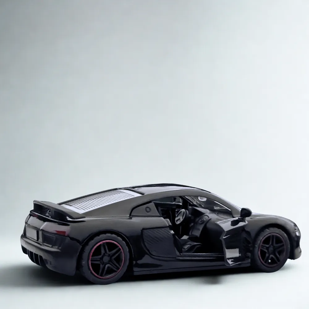 Die-cast metal body Audi R8 scale model car in sleek black finish. Perfect for collectors, car lovers, and display enthusiasts.