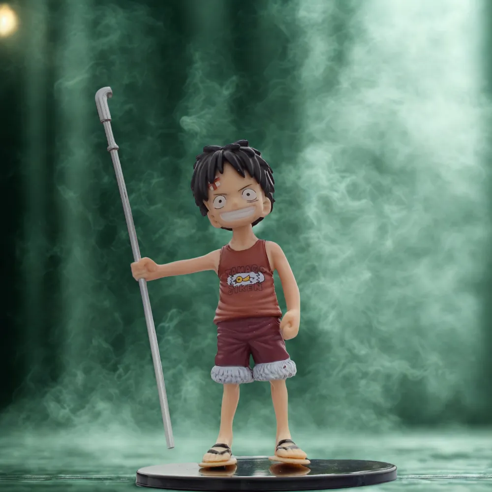 Anime-inspired collectible figure of a cheerful black-haired kid holding a spear, dressed in casual shorts and sandals with a big grin. A fun piece for anime fans and collectors.