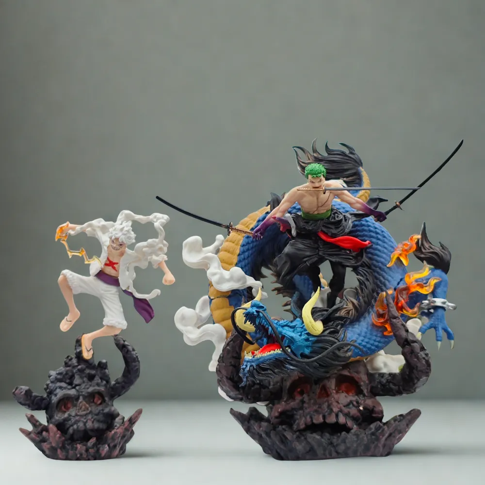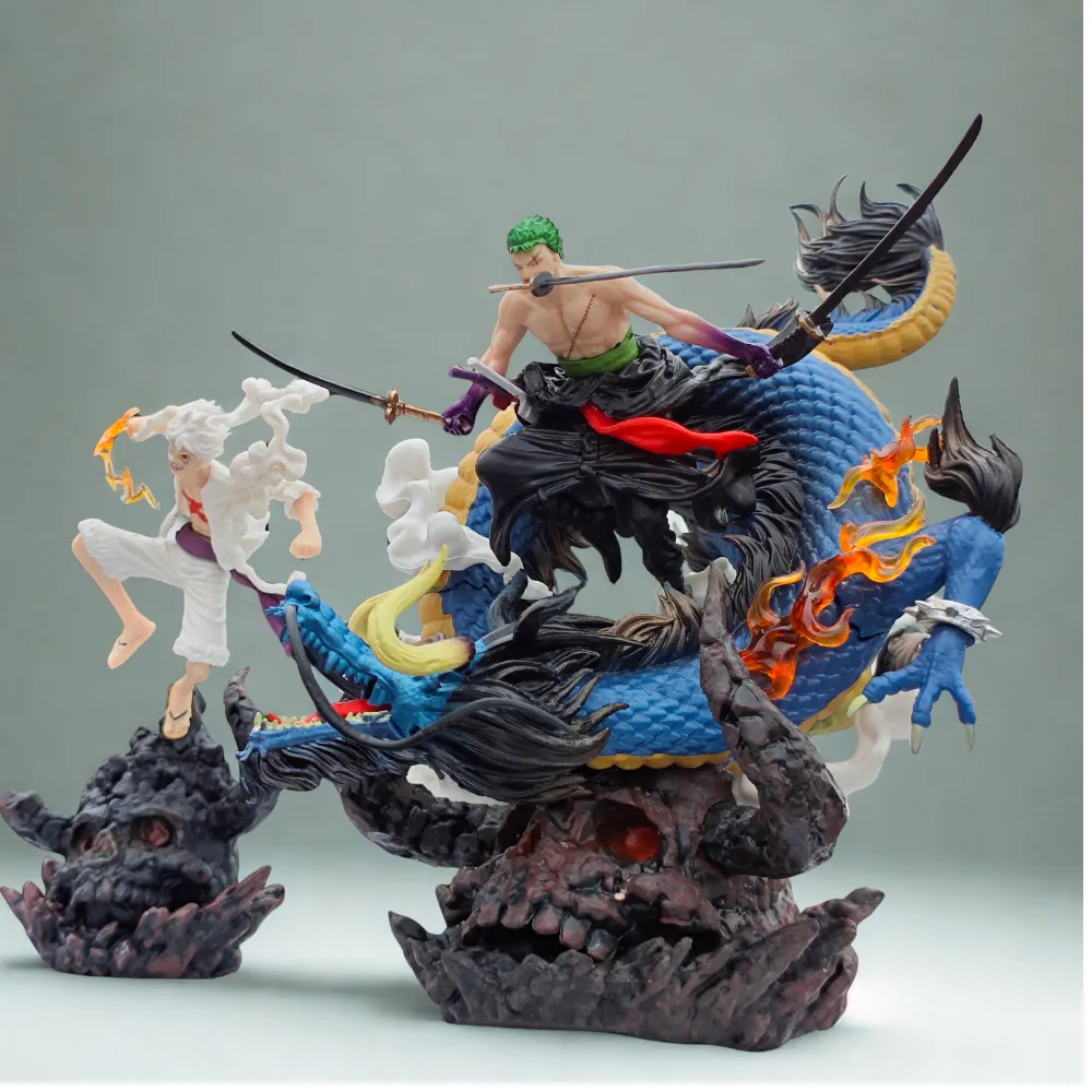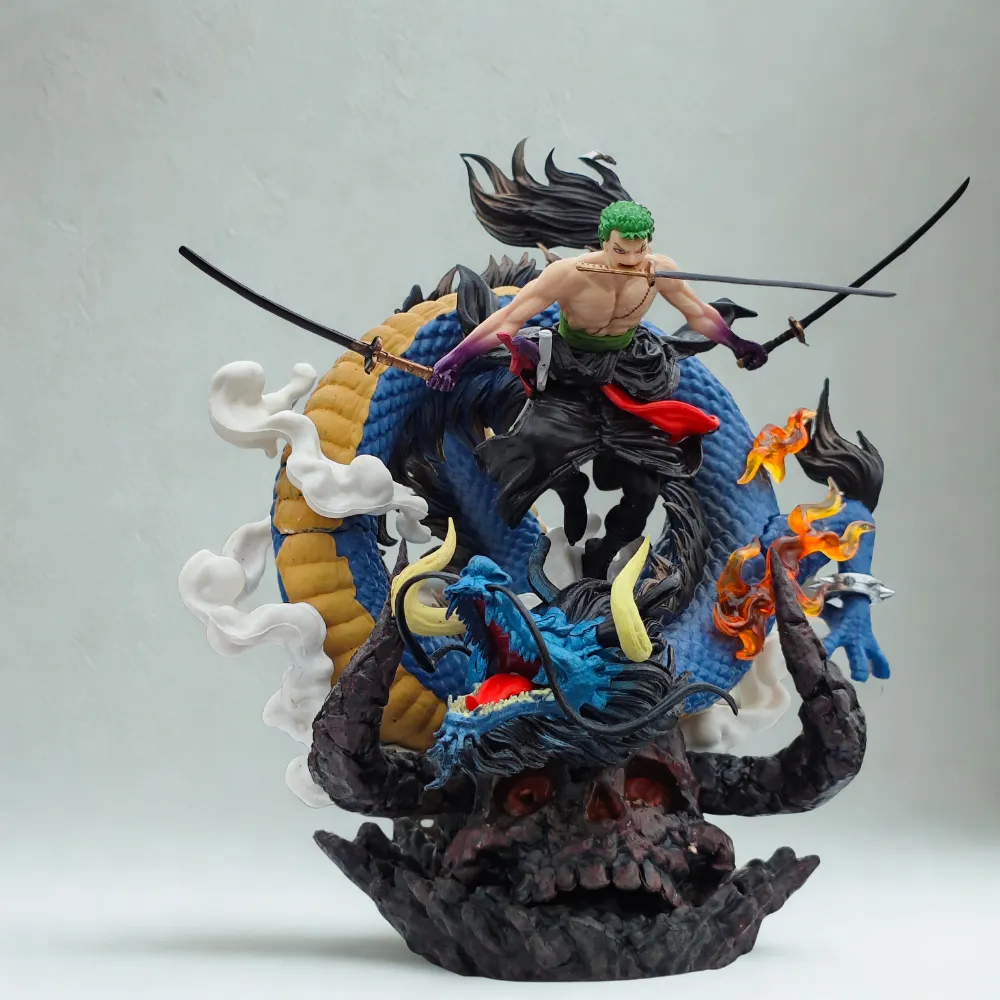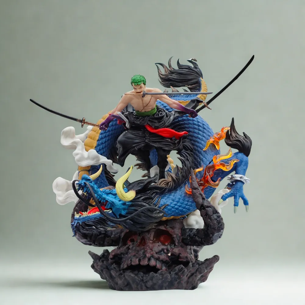Epic anime-inspired figurine featuring a three-sword warrior battling atop a fierce blue dragon with fire and smoke effects. A must-have collectible for action anime fans.